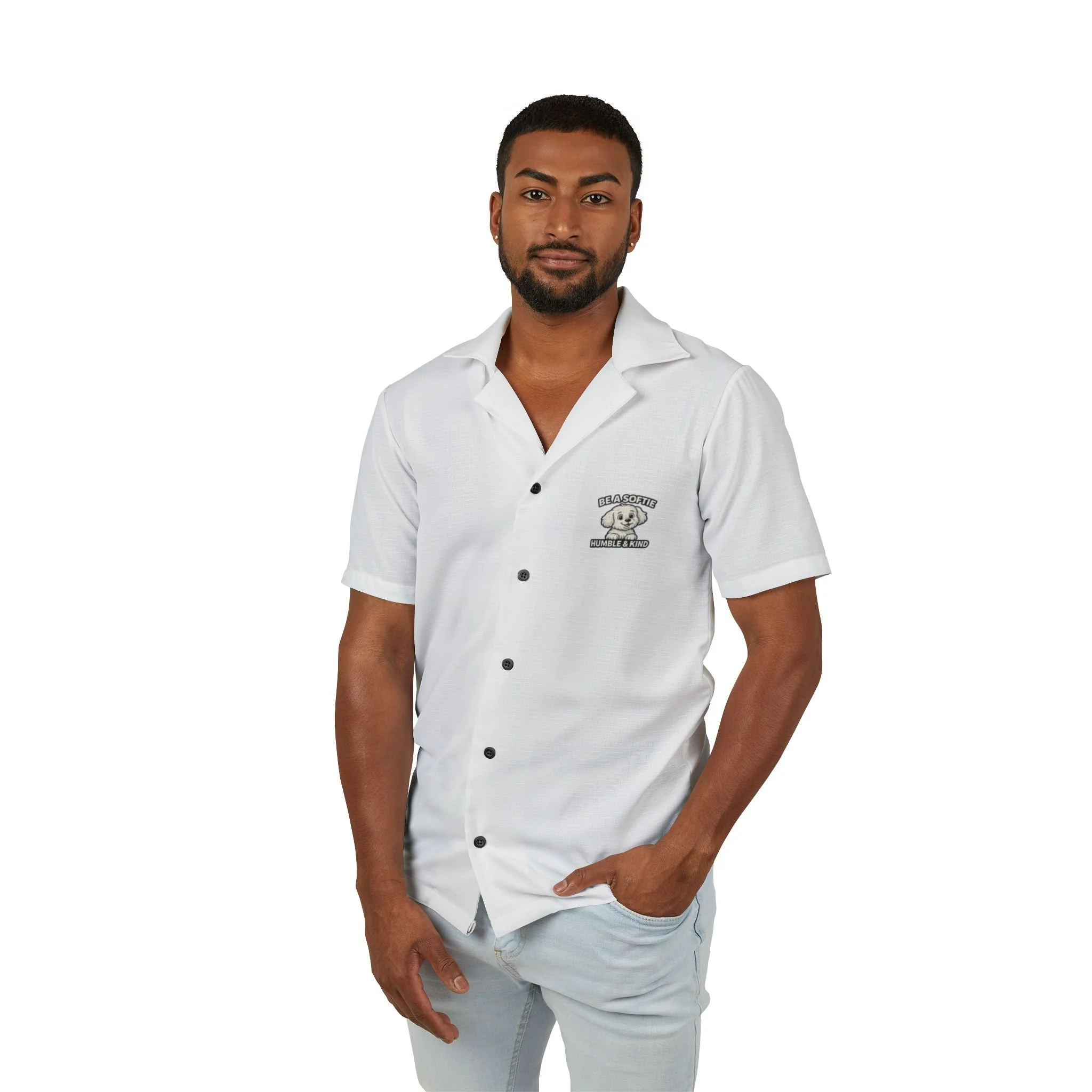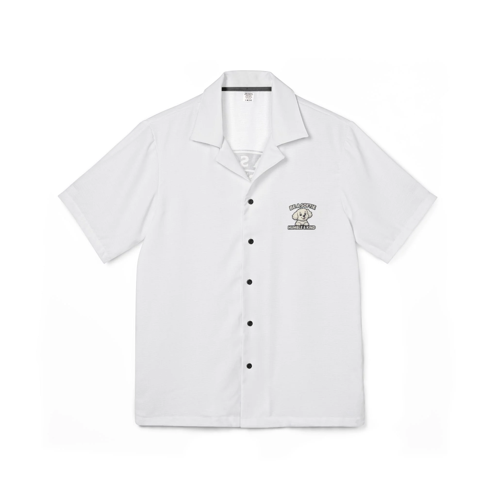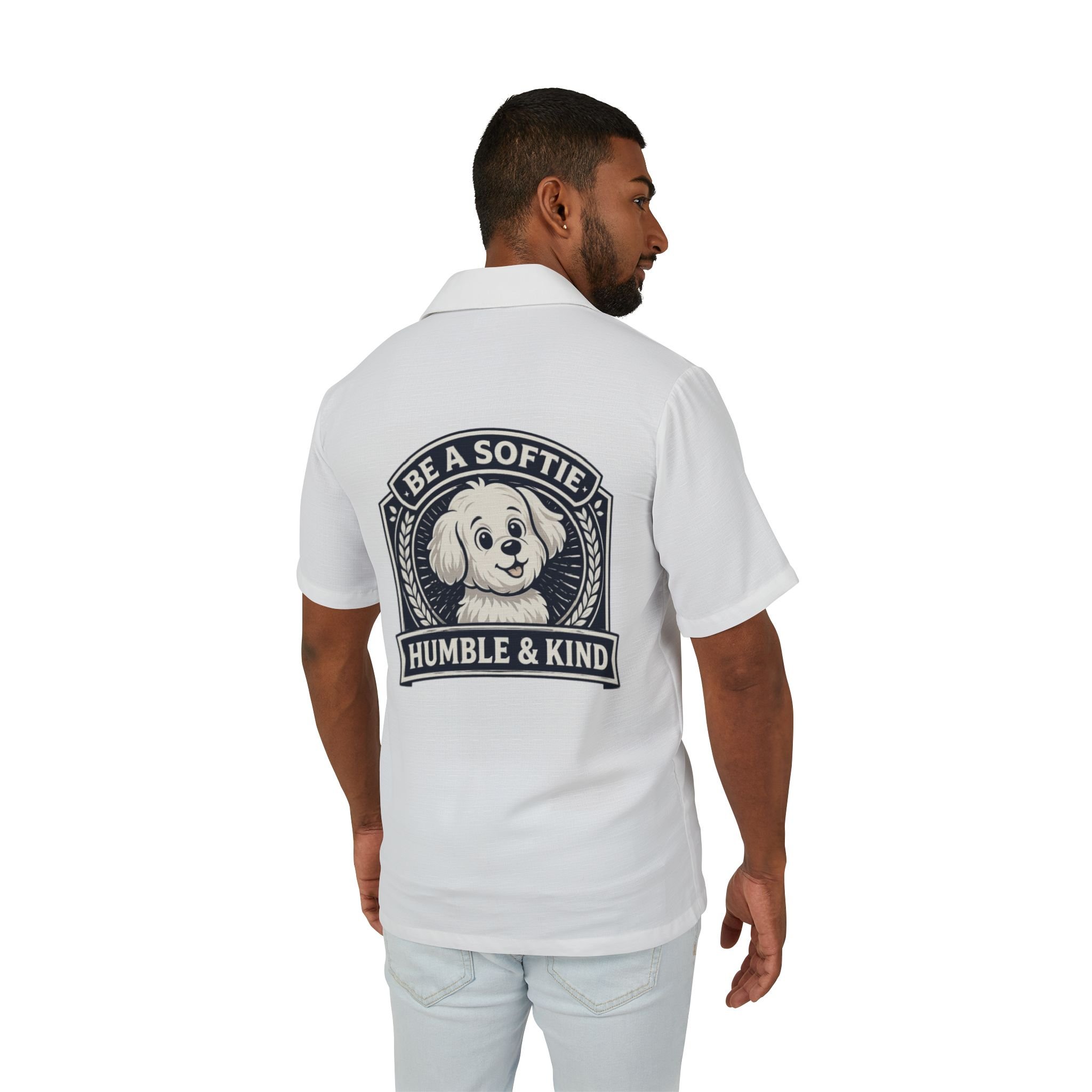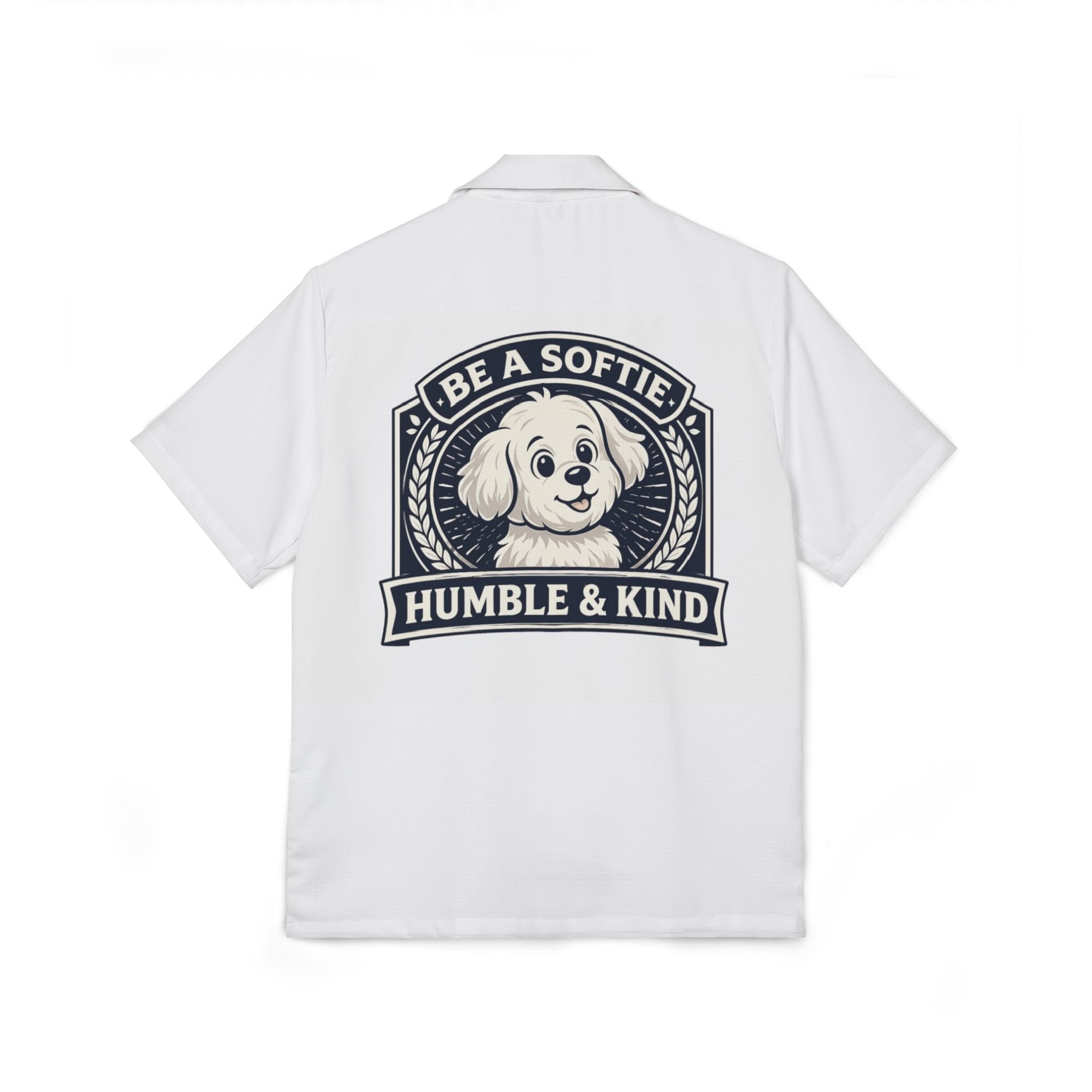 Lightweight and breezy, this Hawaiian-style camp shirt brings an easygoing, sunlit vibe to days by the beach, backyard barbecues, or relaxed weekend wandering. A soft linen-texture fabric and button-front silhouette keep the look classic while the all-over dye-sublimated print holds crisp, high-fidelity artwork that won’t fade with wear. The back artwork—an affable pup framed by the motto “Be a Softie / Humble & Kind”—adds a gentle, uplifting touch that reads warm and personal rather than loud. Wear it open over a tee or buttoned up as a statement piece; it moves with you through heat and humidity thanks to breathable 100% polyester that feels featherlight against skin. Assembled in the USA from globally sourced parts, this shirt blends playful charm with everyday comfort for anyone who likes to keep things kind and casual.